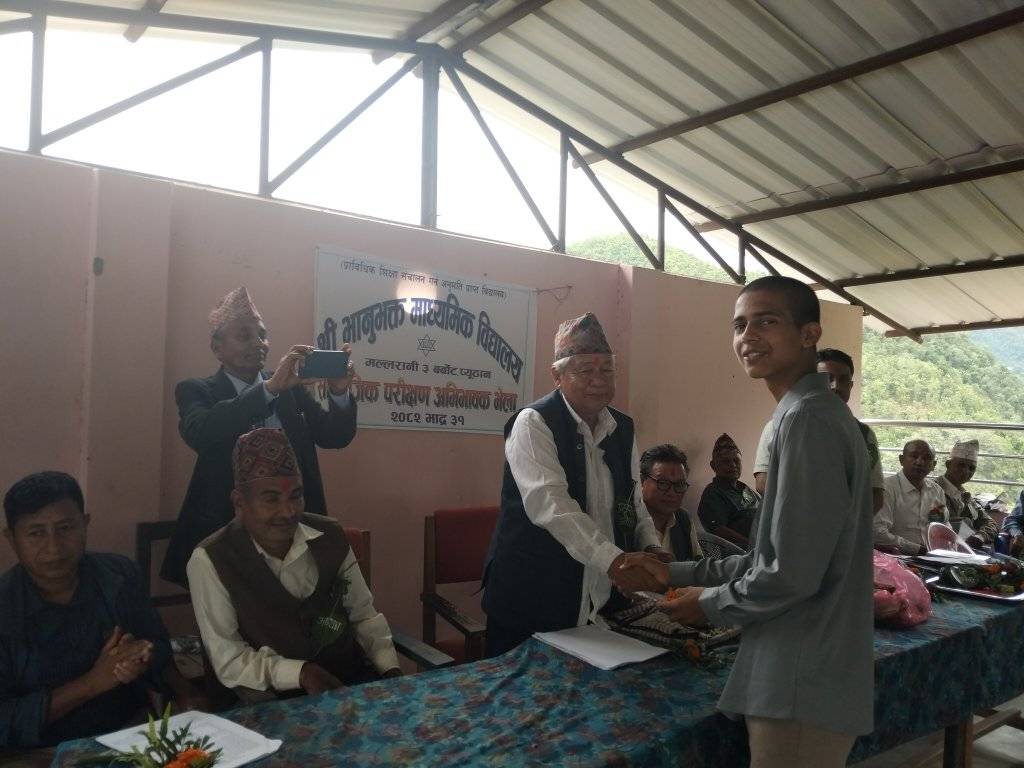 आज मिति २०८२/५/३१ गते यस भानुभक्त माध्यमिक विद्यालयमा सामाजिक परिक्षण भेला सम्पन्न भएको छ । शिक्षक अभिभावक संघका अध्यक्ष खेमराज पोख्रेलको अध्यक्षतामा , पुर्ब जि.बि.स. सभापति बोम बहादुर खत्रीको प्रमुख आतिथ्यतामा सामाजिक परिक्षण कार्यक्रम सम्पन्न भएको छ । कार्यक्रममा बि.ब्य.स अध्यक्ष जिबलाल खत्री ,मल्लरानी गाउपालिकाका शिक्षा शाखा प्रमुख ठाकुर प्रसाद आचार्य , मल्लरानी गा.पाका सस्थापक अध्यक्ष तथा पुर्ब बि.ब्य.स. अध्यक्ष अमरध्वज राना, पुर्व प्र.अ. लेखनाथ पौडेल , पुर्ब बि.ब्य.स का.बा अध्यक्ष फन बहादुर पुन, समाजसेबी राम प्रसाद पोख्रेल , बि.ब्य.स. तथा सि.अ.स.का सद्स्यहरु, शिक्षक,अभिभावक ,बिद्यार्थी लगायत अन्य अतिथीहरुको बाक्लो उपस्थिति रहेको थियो । प्रमुख अतिथि तथा वि.व्य.स. अध्यक्ष बाट पानसमा बत्ती बाली कार्यक्रमको समउदघाटन गरिएको थियो। साथै कार्यक्रममा यस वर्षको एस.इ.इ परिक्षामा जिल्ला प्रथम हुन सफल प्रज्वल पौडेललाई नगद सहित सम्मान समेत गरिएको छ । समाजिक परिक्षण प्रतिबेदन प्रस्तुत तथा सूझाव संकलन हुदै कार्यक्रमका अध्यक्ष श्री खेमराज पोख्रेल बाट महत्वपूर्ण सुझाव सहित कार्यक्रम सम्पन्न भयको छ।